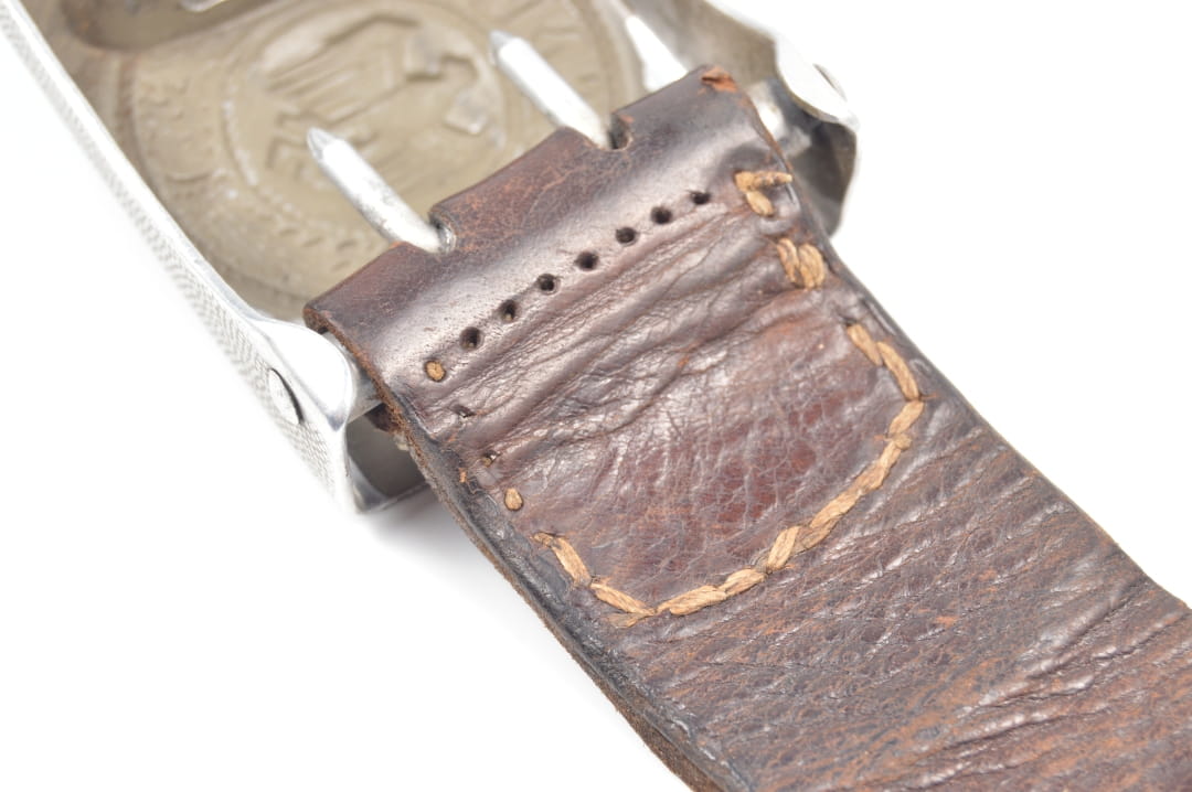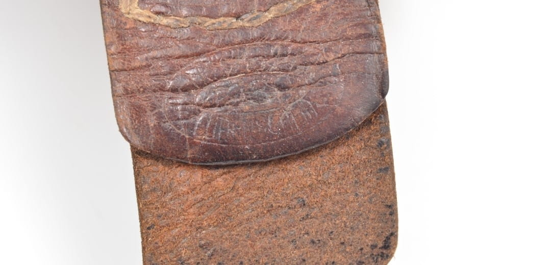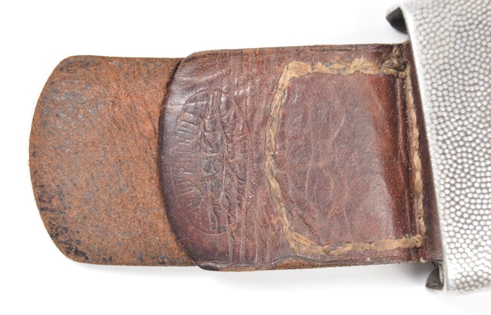 Klamra (Koppelschloß) wykonana z auluminium wraz ze skórzanym językiem, szwy przy widełkach klamry delikatnie