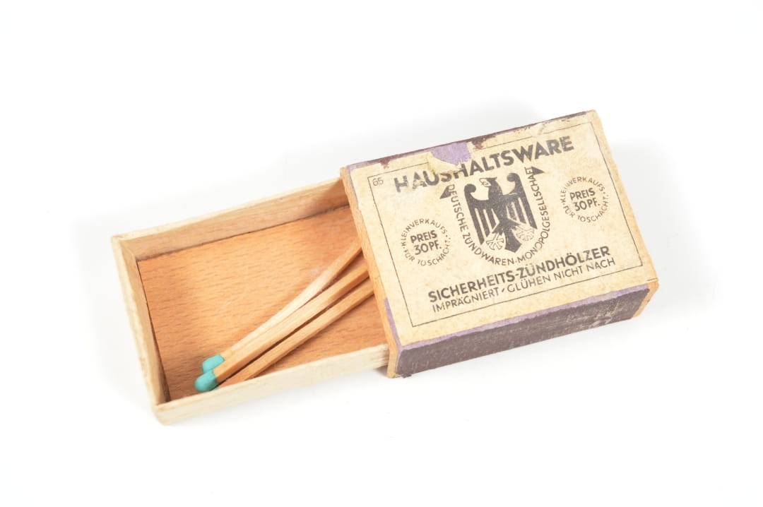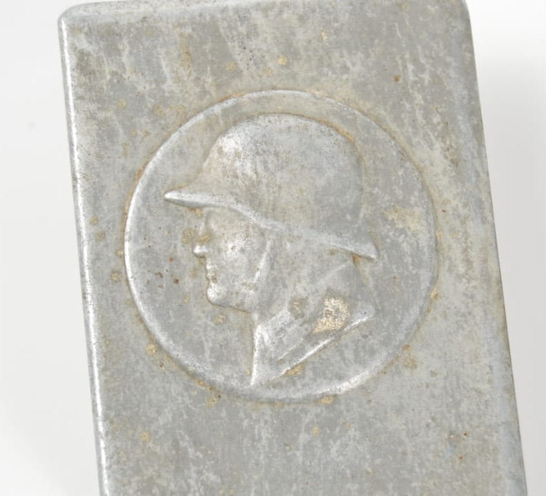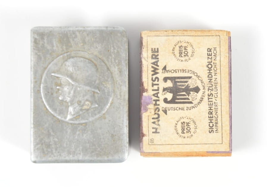 Oryginalne etui Wehrmachtu na zapałki. Stan zachowania bardzo dobry, etui wykonane w cynku, zachowane resztki srebrnej powłoki.