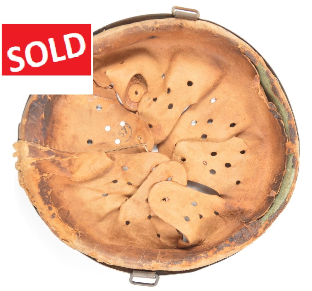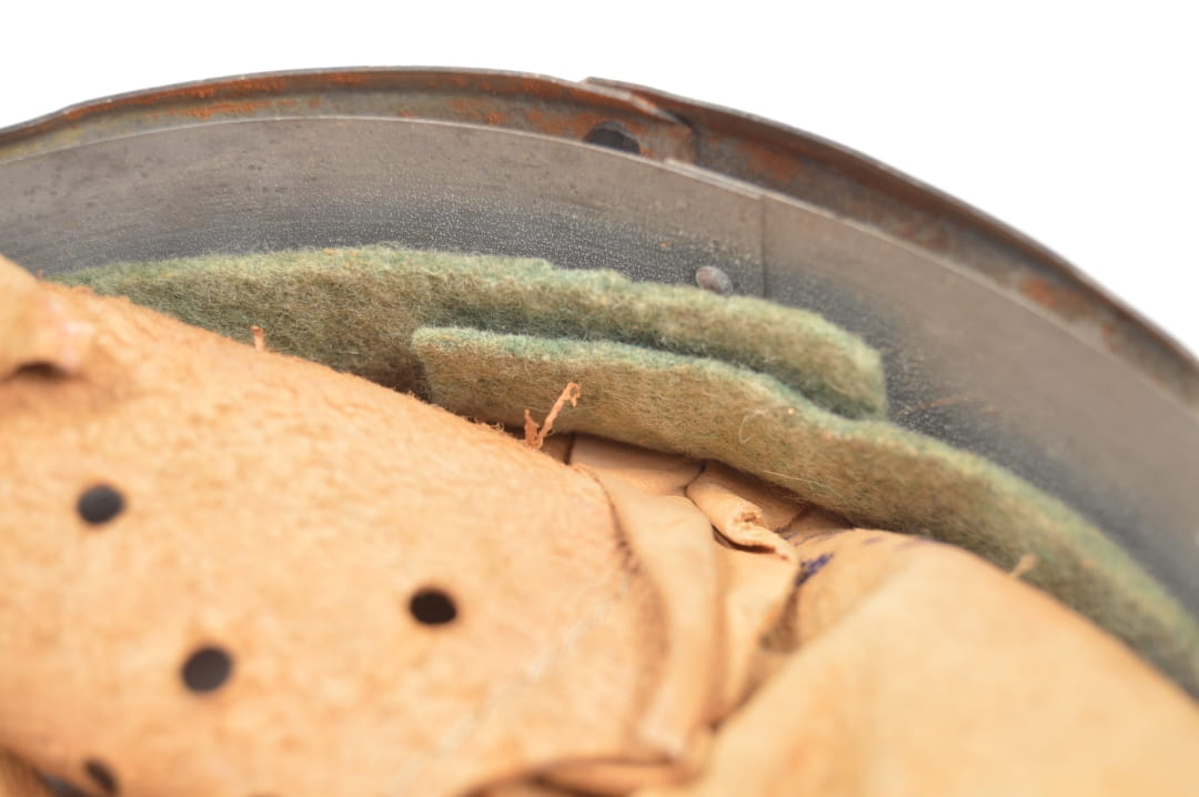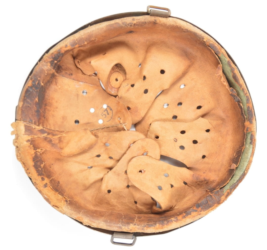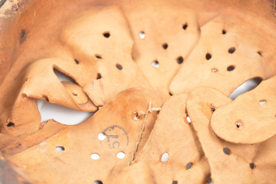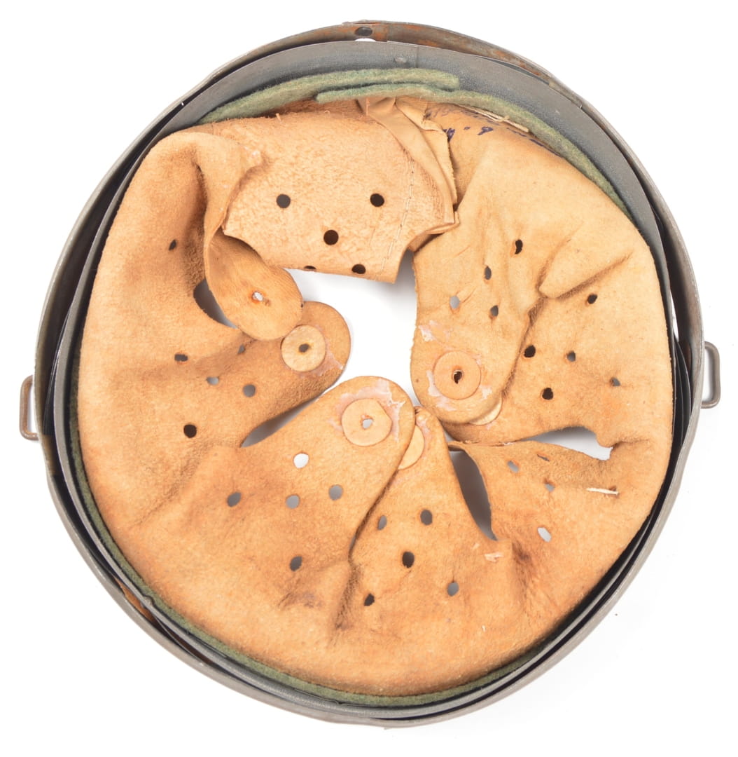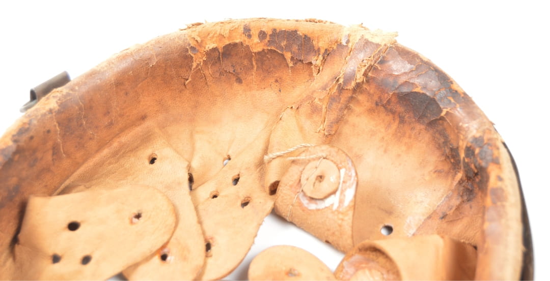 Fasunek do hełmu bojowego. Ogólny stan zachowania dobry, skóra fasunku posiada spękania lecz trzyma się stabilnie.