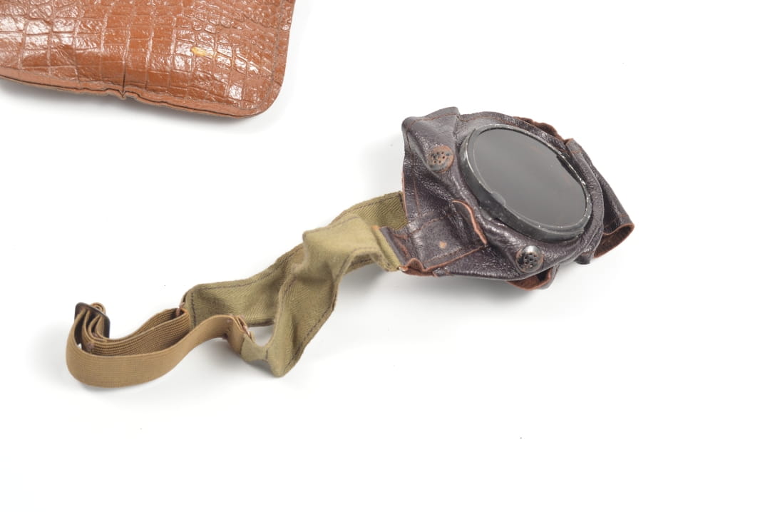 Gogle (Schutzbrille Wehrmacht) w stanie bardzo dobrym, taśma zwężająca elastyczna. Pokrowiec w stanie bardzo dobrym, bez uszkodzeń, nap zapinający bez uszkodzeń.