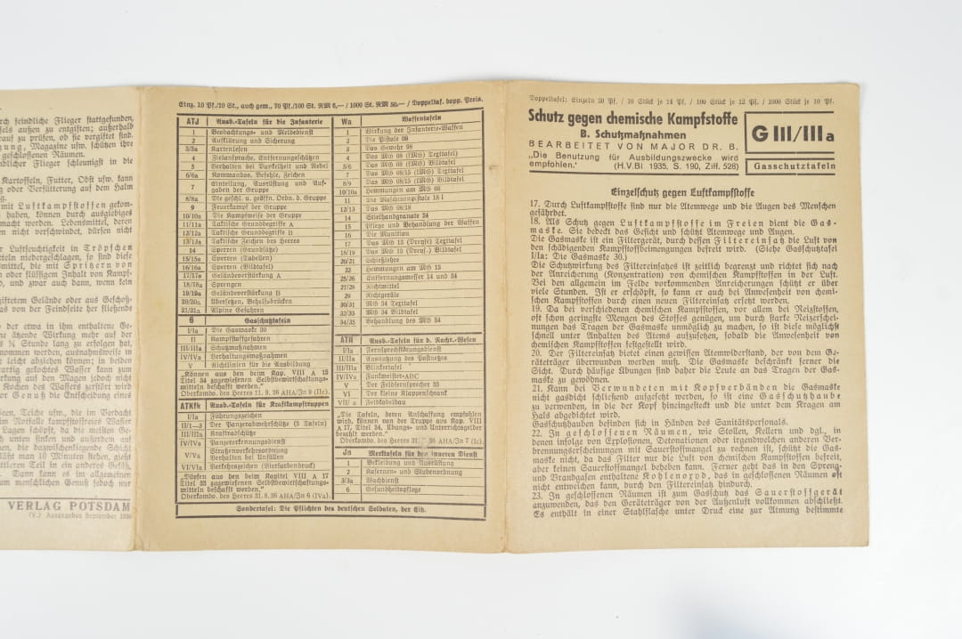 Instrukcja/ broszura ("Schutz gegen chemische Kampfstoffe") Gasschutztafeln G III/IIIa w bardzo dobrym stanie zachowania, kompletna zawiera wszystkie strony.