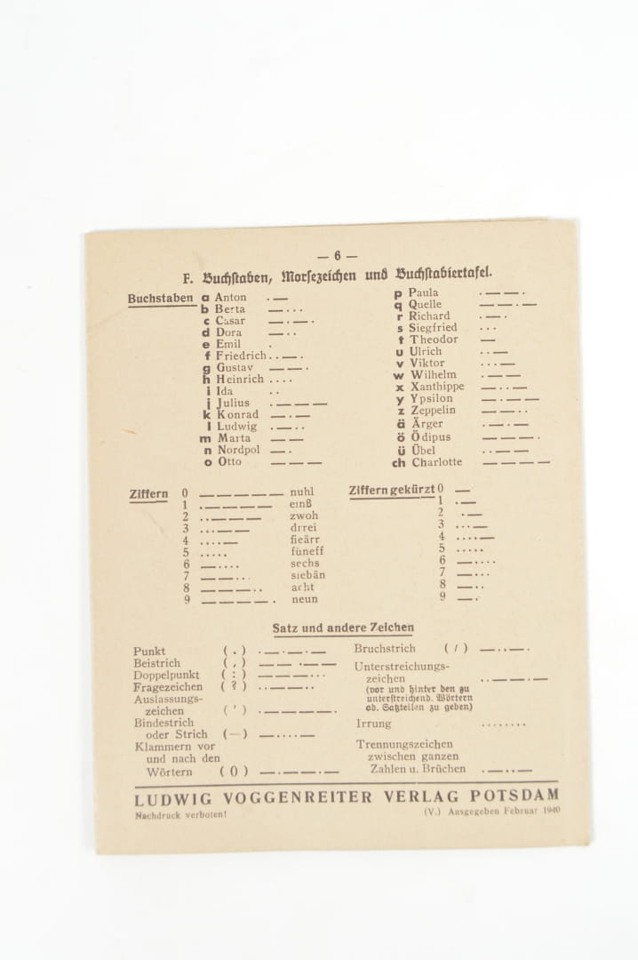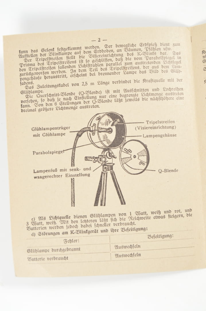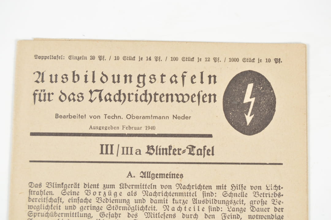 Instrukcja szkoleniowa dla oddziałów łączności (Ausbildungstafeln für das Nachrichtenwesen) wydana w lutym 1940 roku. III / III a Blinker-Tafel" (Tablica dotycząca urządzenia mrugającego/sygnalizacyjnego). Stan zachowania bardzo dobry, wszystkie strony obecne.