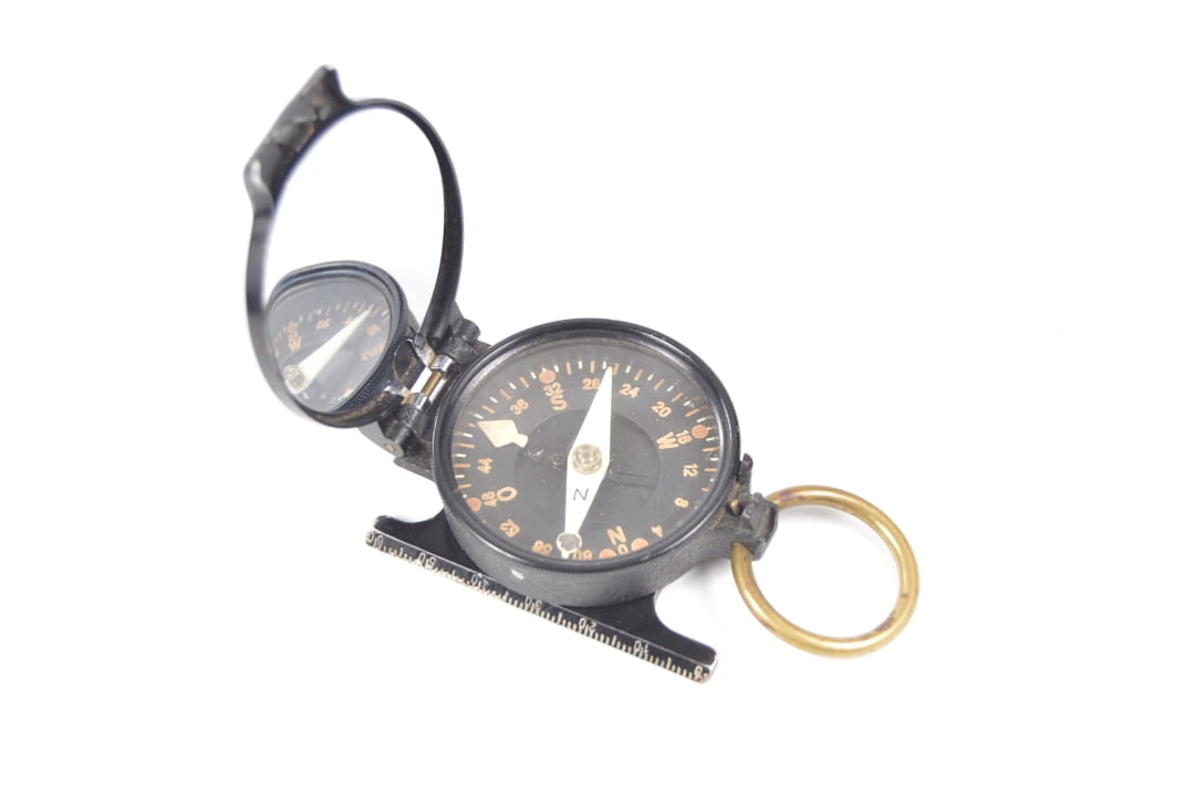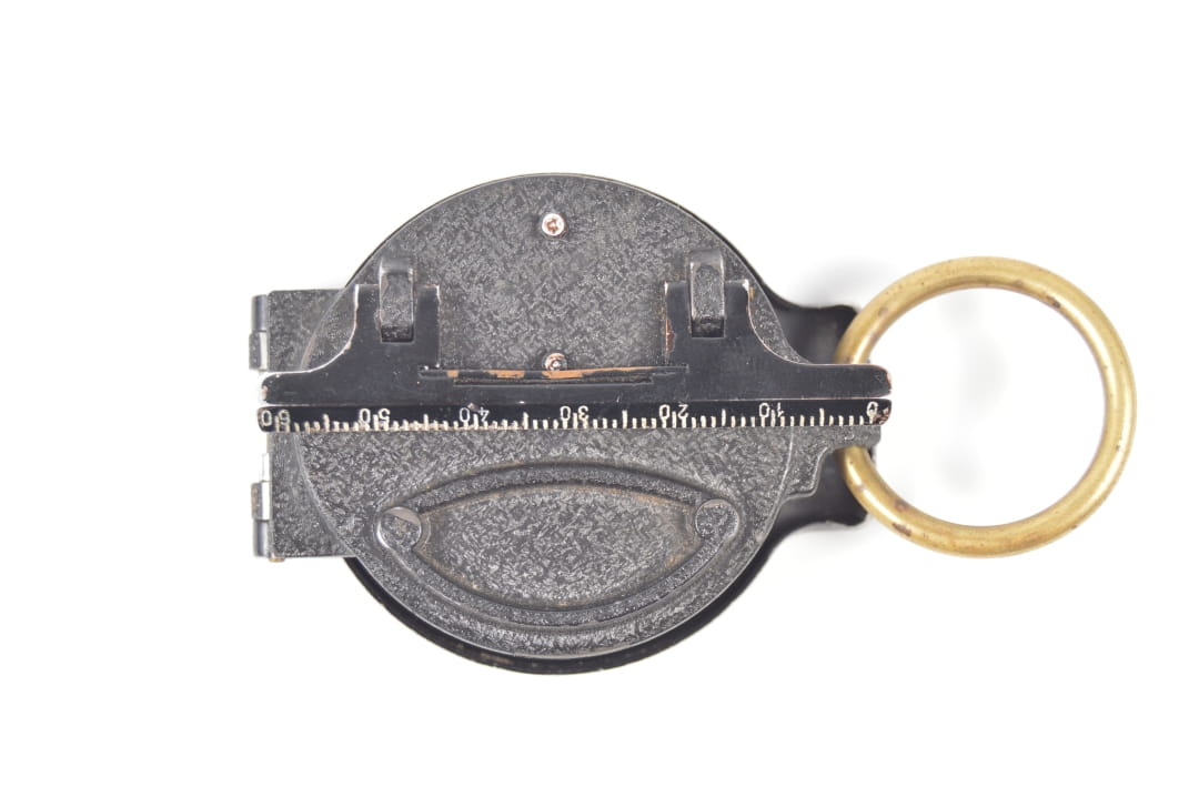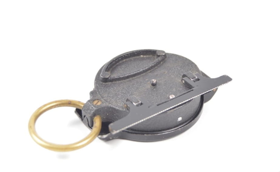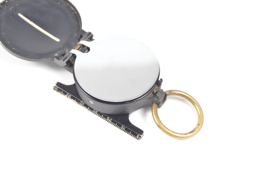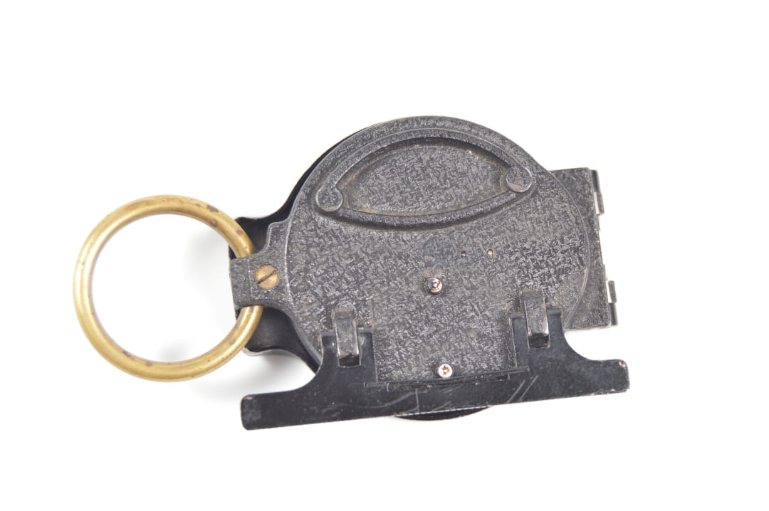 Korpus kompasu wykonany z aluminium z elementami mosiężnymi. Kompas w stanie bardzo dobrym, sprawnie wskazuje