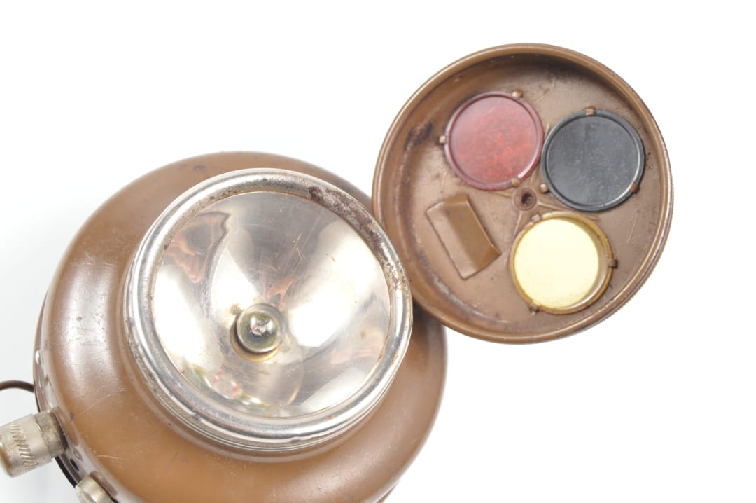 Brak bolca mocującego górne wieko latarki. Regulacja przesłon filtrów sprawna.