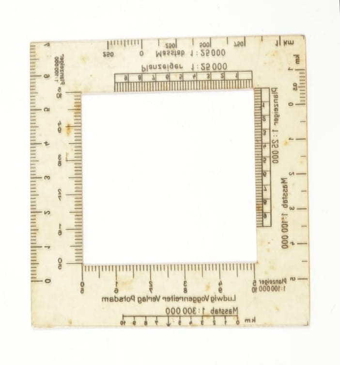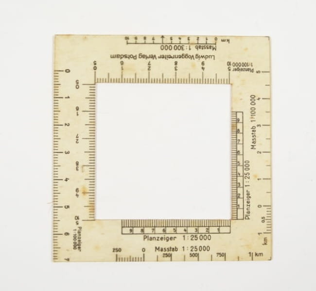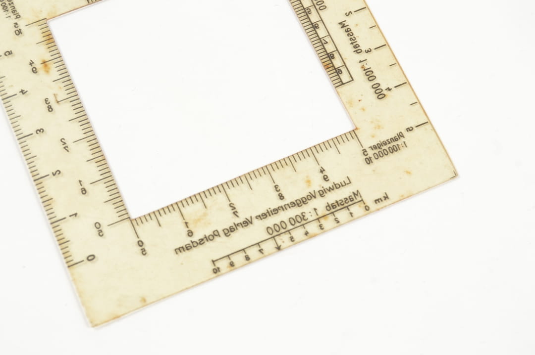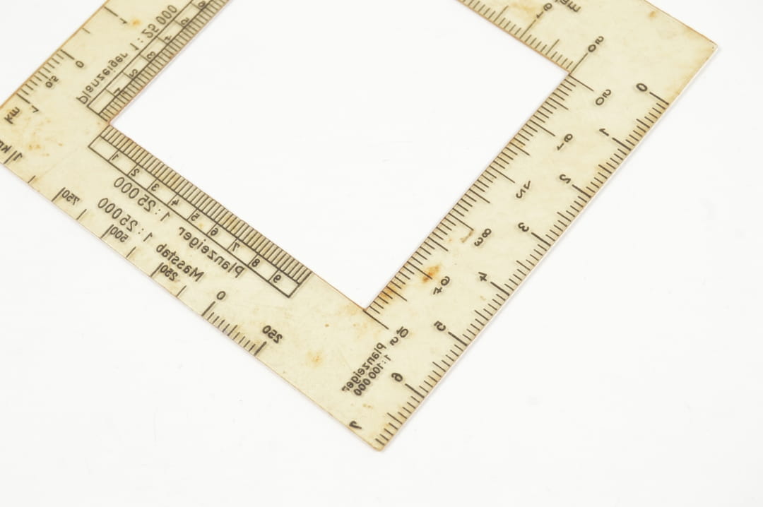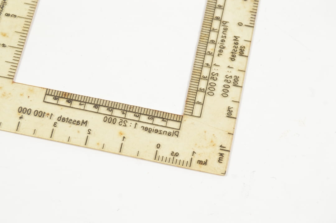Linijka kwadratowa ze skalami do map. Wykonana z tworzywa.