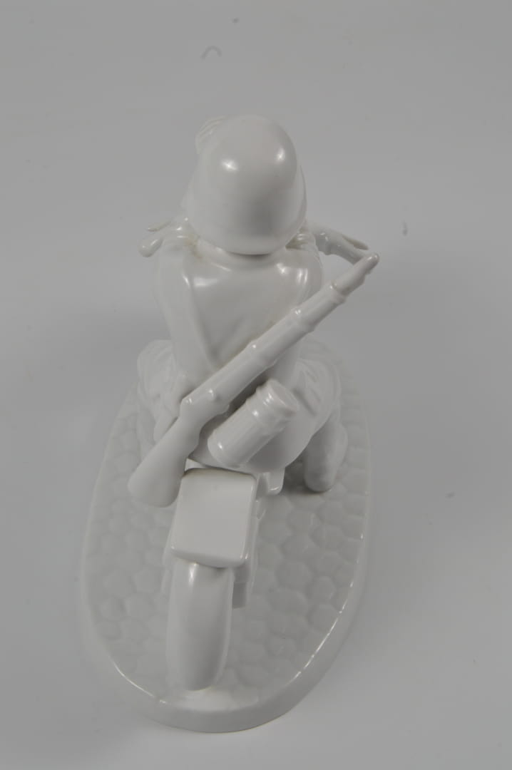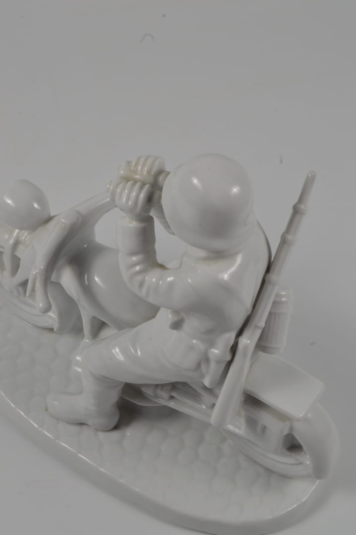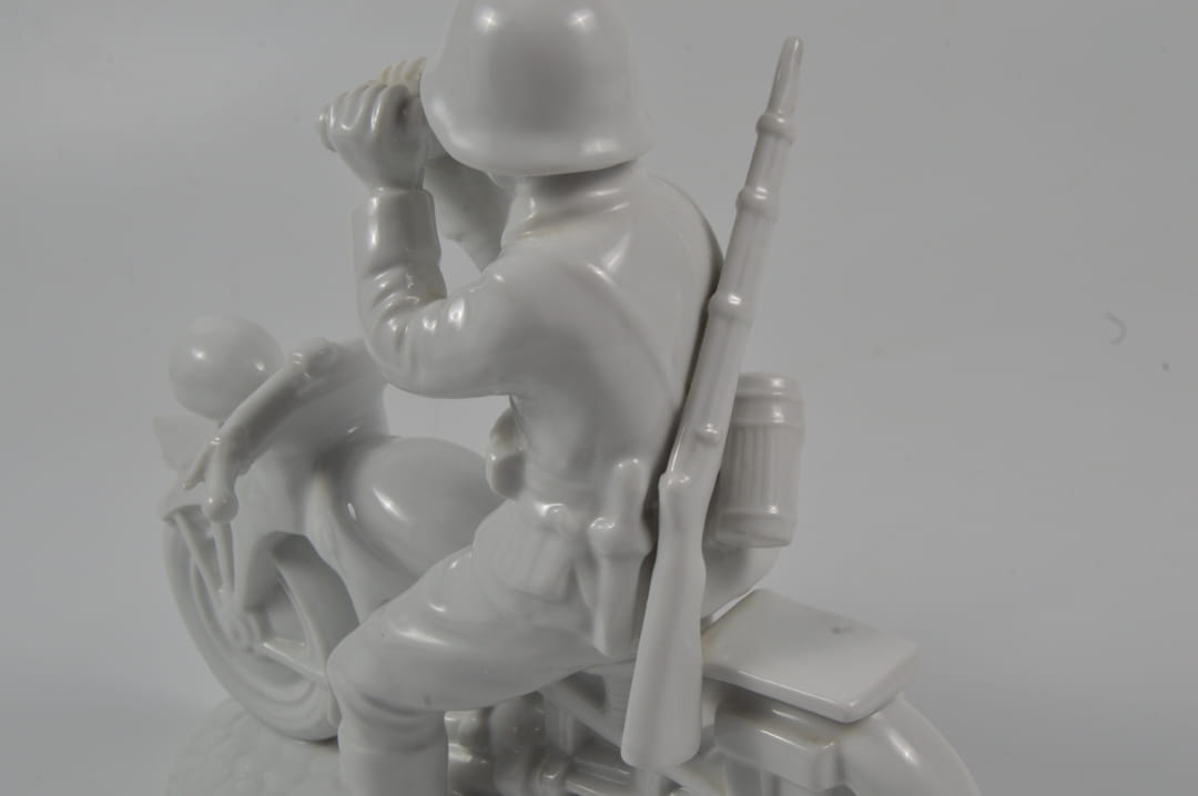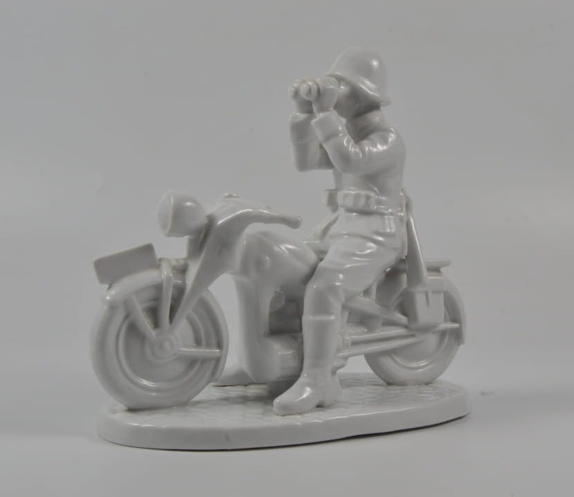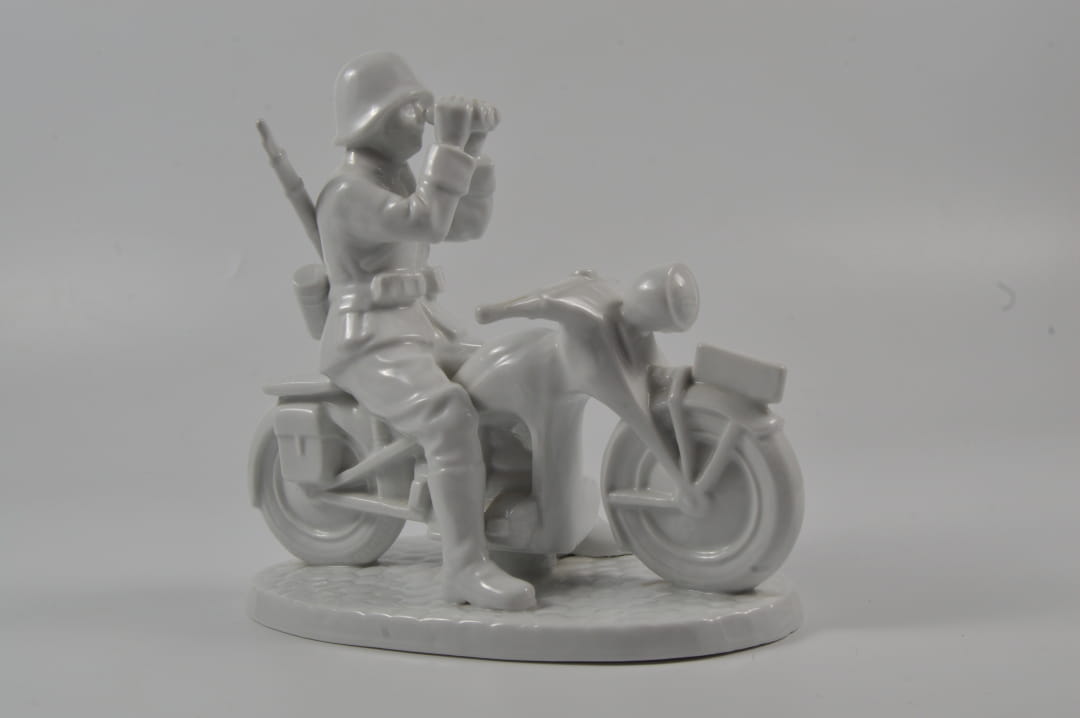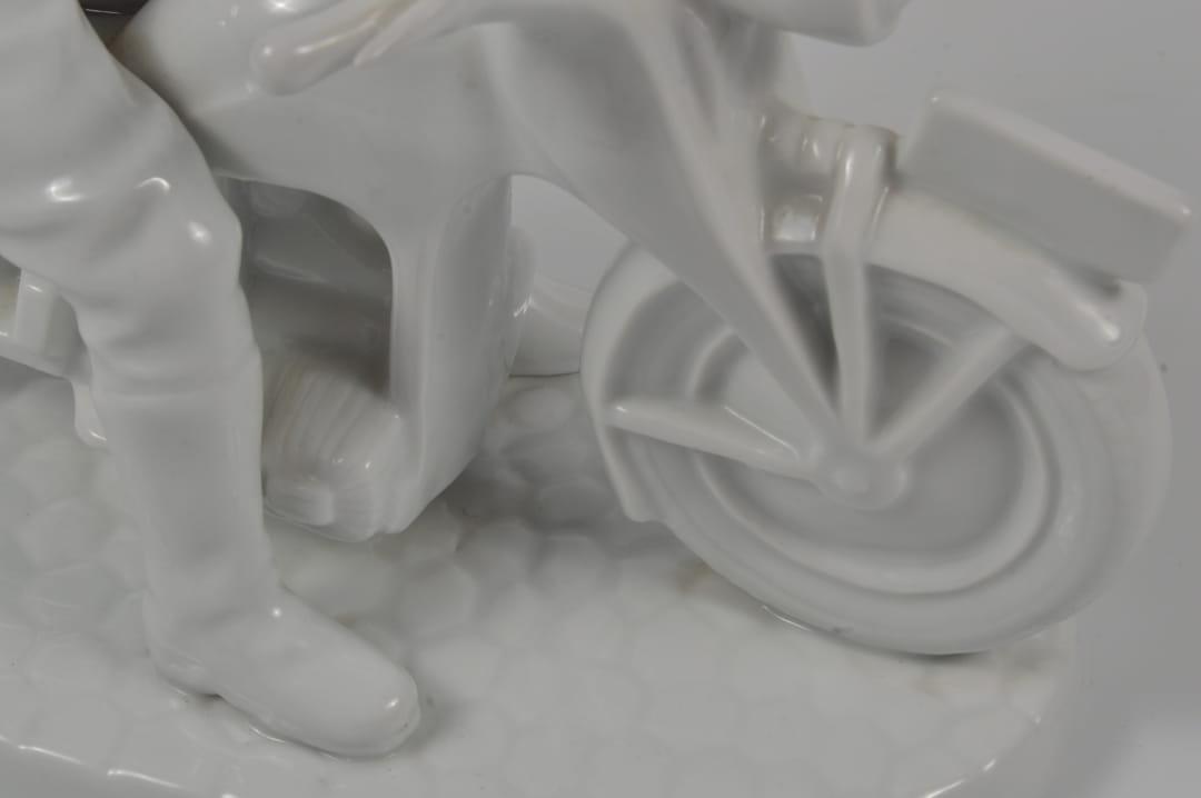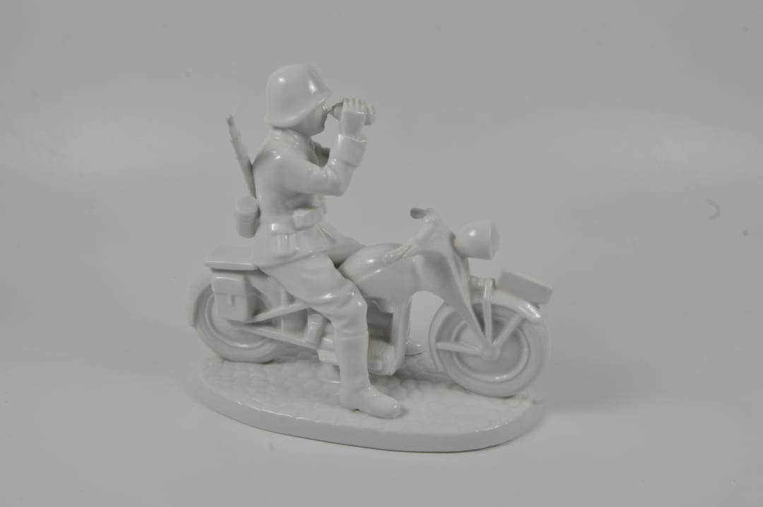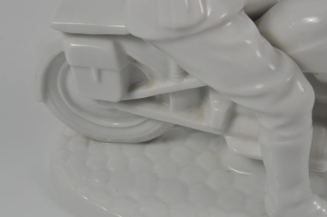 Figurka wykonana z porcelany, przedstawiająca motocyklistę na motorze. Figurka wykonana w okresie III Rzeszy.