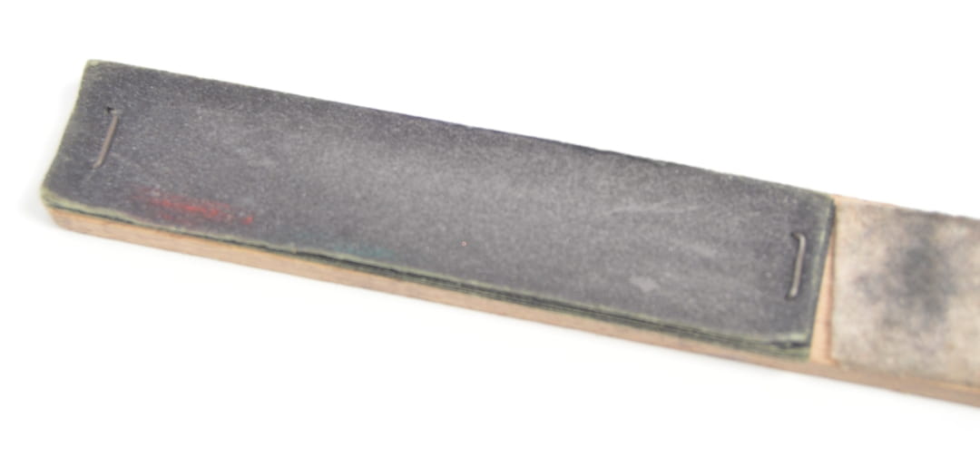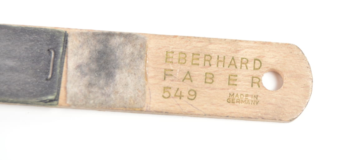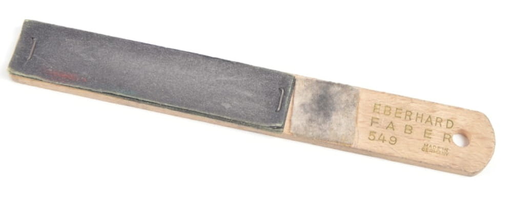 Ostrzałka firmy Eberhard Faber 549 służąca do ostrzenia ołówków i kredek. Na ostrzałce zamontowane arkusze papieru ściernego. Ostrzałka wykonana z drewna