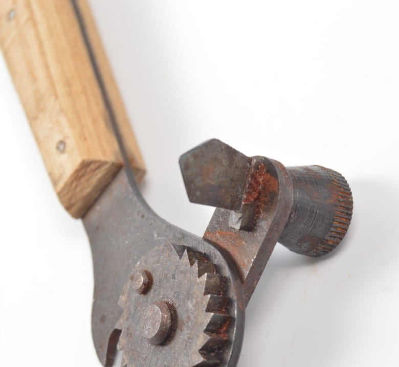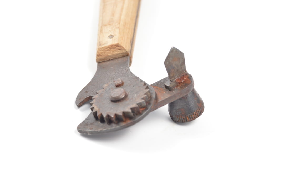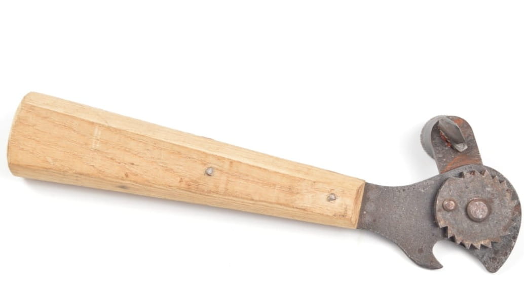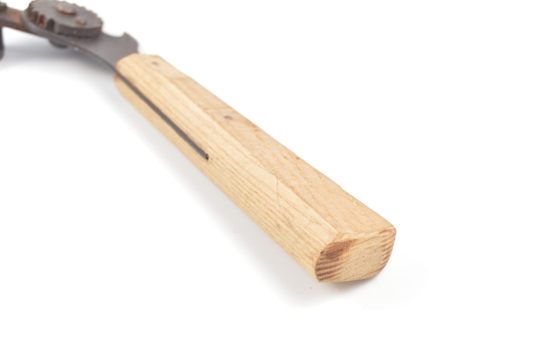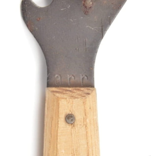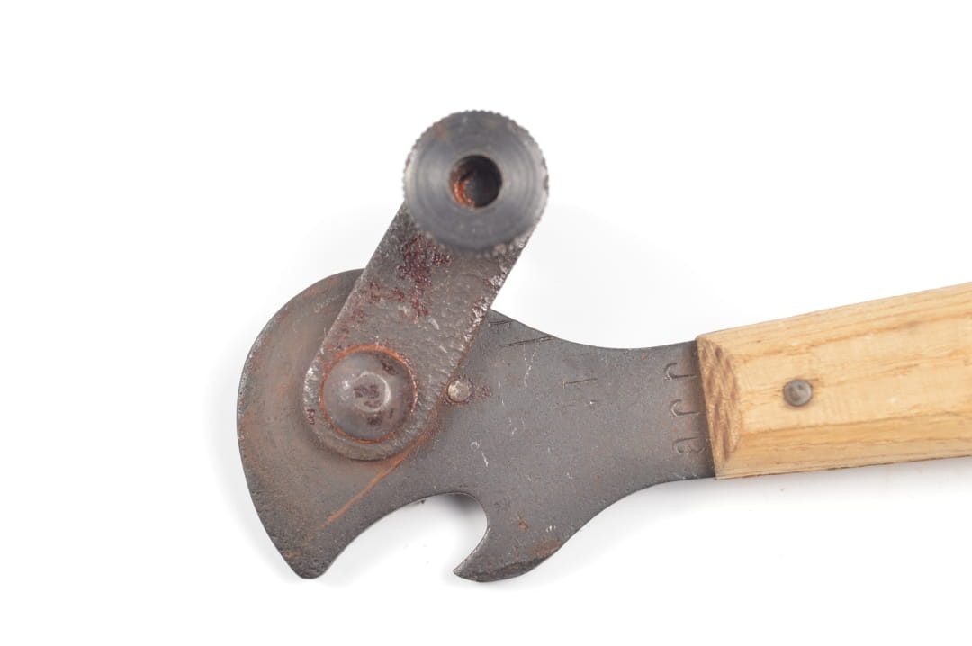 Niesamowicie rzadko spotykany otwieracz do konserw sygnowany kodem producenta arr -,, Braunsweigische Blechwarenfabrik G.m.b.H., Braunschweig,, orginalny drewniany uchwyt.