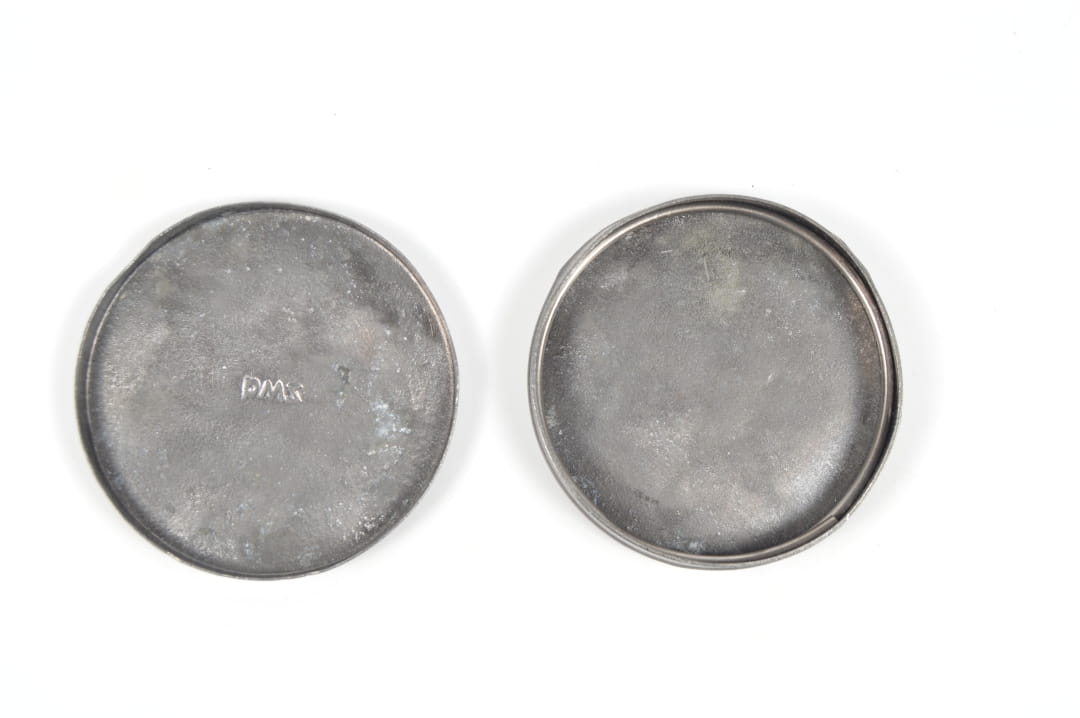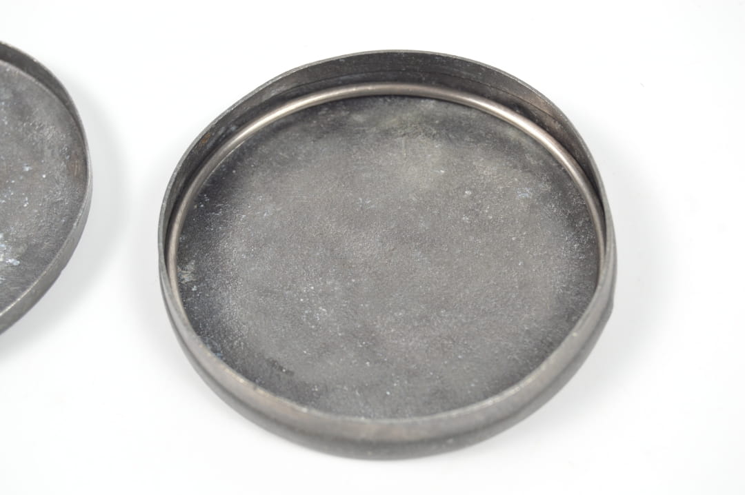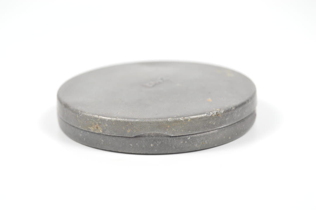 Pojemnik wykonany z blachy cynkowej. Widoczna sygnatura bwz. Stan zachowania dobry.