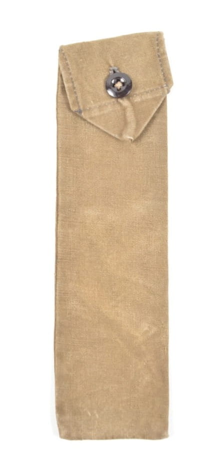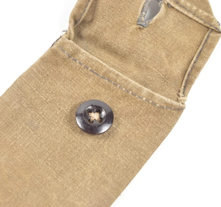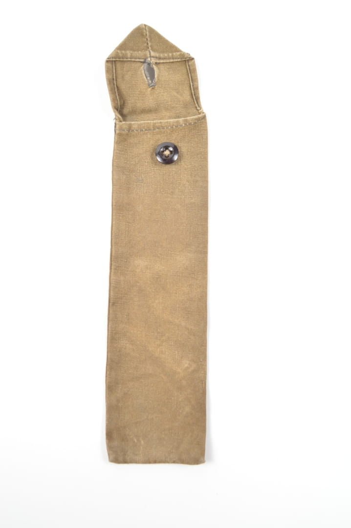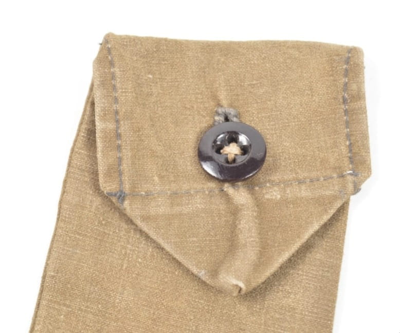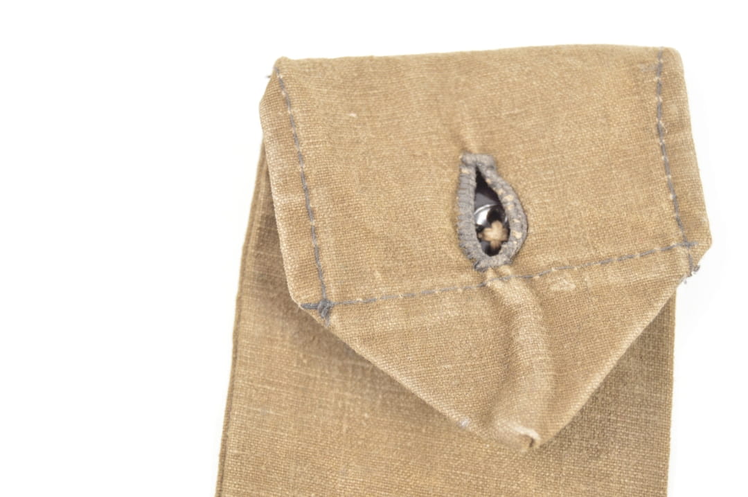 Pokrowiec na zestaw sztućców wykonany z materiału, oryginalnie przyszyty guzik.