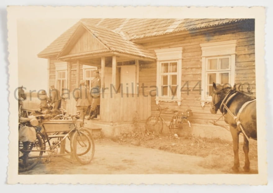 Zdjęcie zrobione gdzieś na froncie wschodnim. Przedstawia żołnierzy i rowery wojskowe Truppenfahrrad.