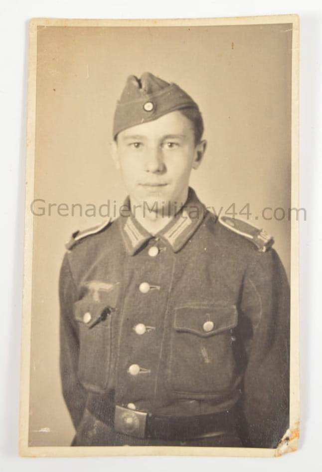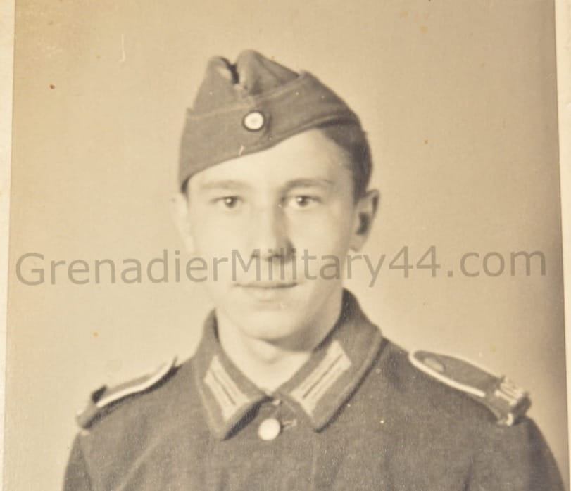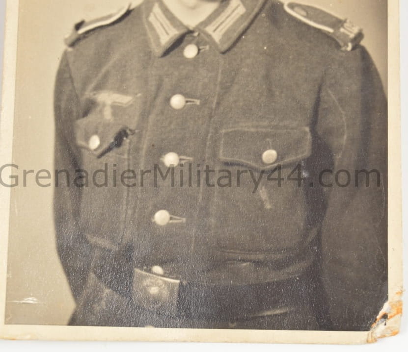 Zdjęcie przedstawiające żołnierza piechoty. Jeden z rogów zdjęcia zagięty.