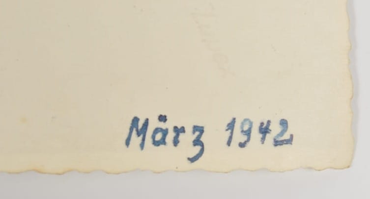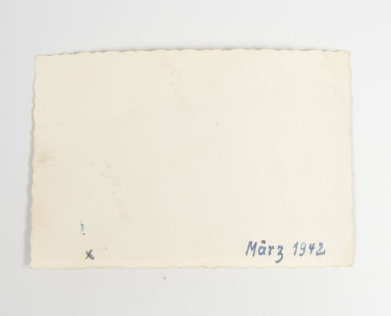 Zdjęcie przedstawiające żołnierzy pozujących przy ciągniku artyleryjskim Sd.Kfz.8. Zdjęcie wykonane w marcu 1942 roku. Wymiary zdjęcia to: 9cm x 6cm