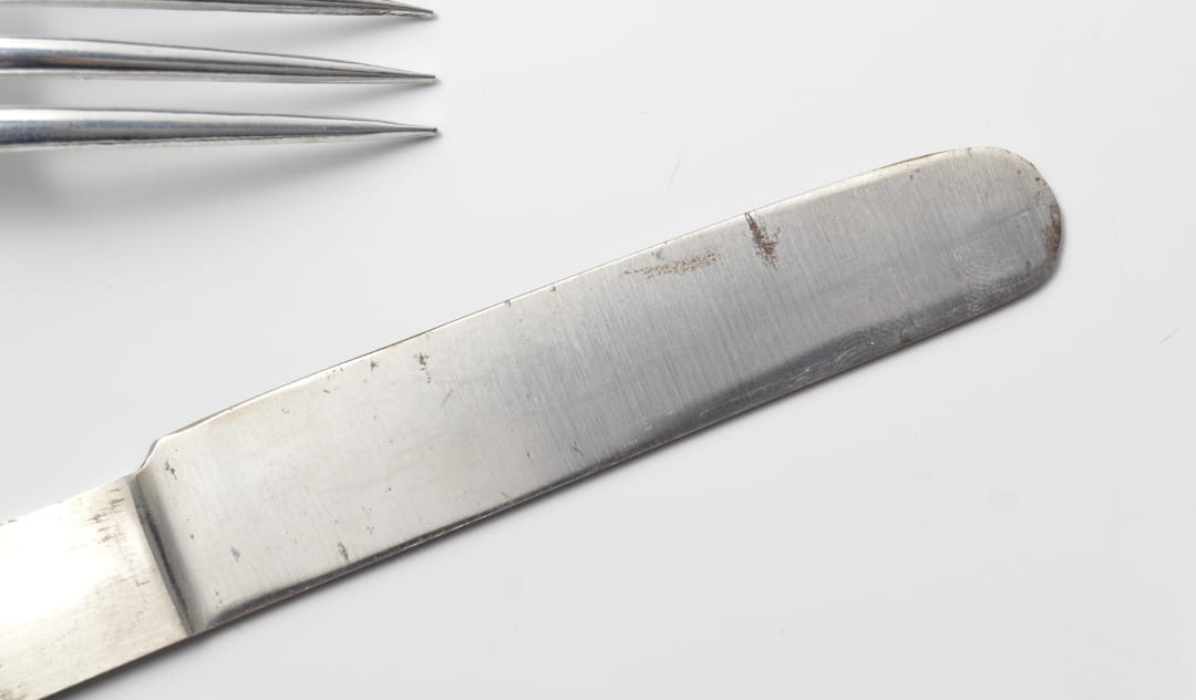 Nóż równie wykonany ze stali nierdzewnej, na końcówce noża delikatne zużycie.